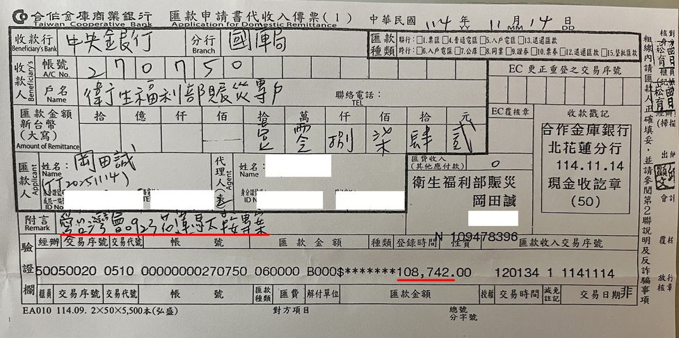 当会で集まった寄付金は、まだ花蓮県政府の寄付窓口なら間に合うと言われましたが、2018年に花蓮県政府で多額の寄付金が使途不明になった事もあるため、台湾政府が被災地で使用して頂く目的の口座に入れて頂き、最近(11月13日)宜蘭・蘇澳で発生した台風災害にも使用して頂ける汎用性ある形で処理をお願いしました。一応納付書の備考欄には花蓮台風被災向けとして頂いております。